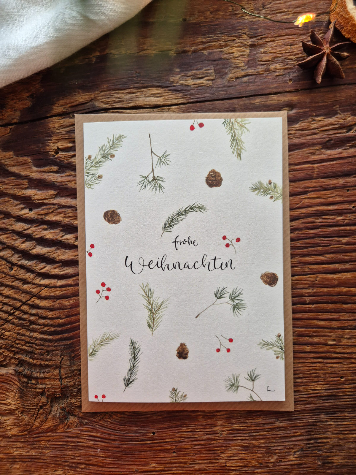 Auf der Karte sind viele verschiedene Tannenzweige sowie mein eigener Schriftzug „Merry Christmas“ zu sehen.